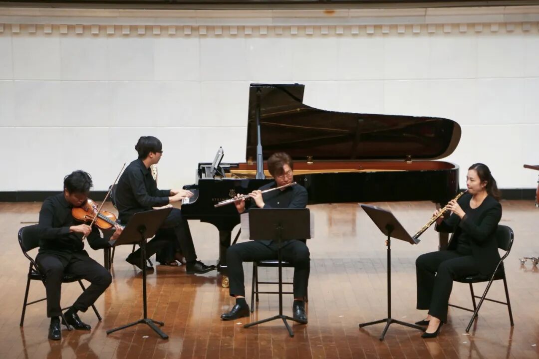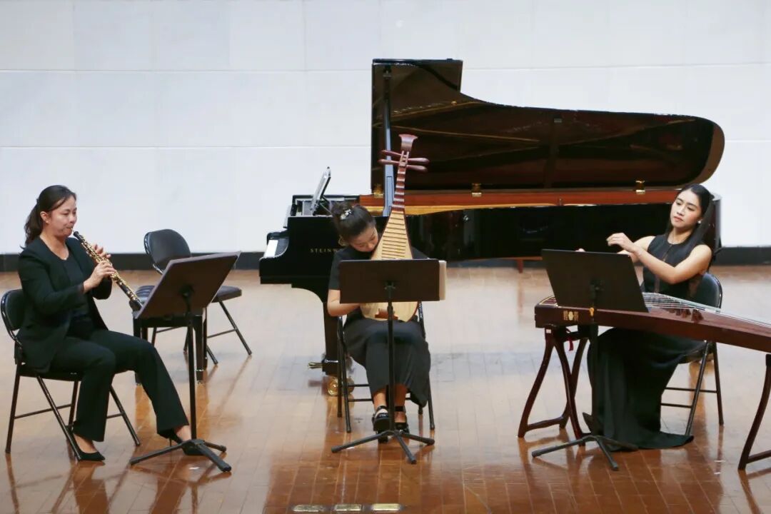 音乐会作曲以独特的创作视角展现艺术与文化的深度融合。青年作曲家刘豫徽的《思南・凤栖簧》(琵琶:特邀焦子珊)作为“思南”系列第二部,深入挖掘黄梅戏音乐及其历史语境,将传统戏曲元素与现代作曲技法巧妙结合。广西艺术学院教师团队亦贡献多部力作:丁铃创作的钢琴独奏《山语》(钢琴:陈天乐),灵感源自马栋梁教授诗词《山语・咏志》,以琴音勾勒山野幽然、竹影摇曳的意境;邱阳创作的《暮霞潮声》(长笛:李昂、双簧管:徐晓、小提琴:黄鹏、钢琴:陈天乐)“为长笛、双簧管、小提琴与钢琴而作”,以音绘景,捕捉暮色与潮汐交织的朦胧美感;邱玉兰创作的《渡影》(双簧管:徐晓、琵琶:毕加杞、古筝:杨旻谕),从宁明花山崖壁画中汲取灵感,通过双簧管、琵琶与古筝的对话,重现壮族先民的生活图景与精神世界;易俏创作的《侗族音画》(钢琴:陈天乐)将侗族大歌融入钢琴独奏,以灵动音韵展现侗族文化的魅力;吴丽云的《星舞》(长笛:李昂、双簧管:徐晓、小提琴:黄鹏、大提琴:赵瑞青)以长笛、双簧管、小提琴与大提琴编制,令音符如星辰般翩跹“舞动”;陈威的《木叶漂流记》(小提琴:黄鹏、万俊兰 中提琴:戴贞贞 大提琴:赵瑞青 钢琴:陈天乐)以钢琴五重奏形式,融汇广西“木叶”乐器意象,讲述千年音乐传承的漂流之旅;刘睿的《空山孤氲》(双簧管:徐晓 钢琴:陈天乐)援引张九龄《湖口望庐山瀑布泉》诗意,借双簧管与钢琴营造空灵幽远的山水意境;戴伟与研究生郭成朗共创的《鼓楼叠梦》(小提琴:黄鹏、琵琶:毕加杞、笙:熊昊、二胡:马恒钰、大提琴:赵瑞青、钢琴:陈天乐、打击乐:吴俊菲)则以室内乐组曲形式,展现侗族文化的深厚底蕴与艺术张力。